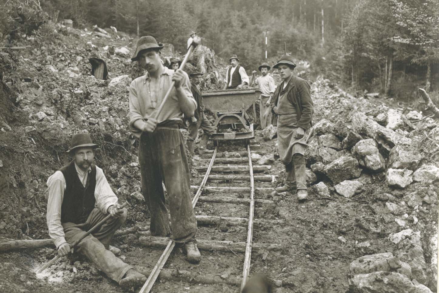 Man kann es sich heute kaum vorstellen, wie es den 800 überwiegend bosnischen Gastarbeitern in nur zweijähriger Bauzeit gelang, die damals noch 9,95 km lange Bahnstrecke mit sieben Tunnels, acht Galerien, zwölf Brücken und aufwendigen Stützmauern zu errichten. Um die Bahn vor Steinschlägen und Lawinen zu schützen, hatte man die schwierigste der möglichen Baulinien entlang der steilen Nordwände des Wildalpjochs und des Soins gewählt. Was allein an Material bewegt und behauen werden musste, war, auch unter dem Aspekt heutiger Möglichkeiten, gewaltig.